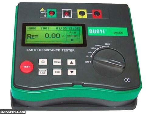 ارت سنج 4 پل دیجیتال مدل DY-4300 با ست کامل لوازم ، برای اندازه گیری مقاومت زمین و خاک در محدوده 0 _ 20.99kΩ ، با دقت 0.001 اهم محصول کمپانی DUOYI میباشد. این دستگاه ارت سنج 4 پل DY-4300 دارای 1000 نقطه حافظه برای ثبت مقادیر اندازه گیری شده مقاومت زمین و خاک است.