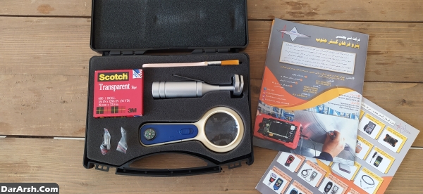 خراش انداز (Cross Cut) مدل 240 به همراه چهار عدد تیغه (1 میلیمتر 11 دندانه،1 میلیمتر 6 دندانه، 2 میلیمتر 6 دندانه و 3 میلیمتر 6 دندانه) ، كيف حمل ، ذره بین مخصوص ، برس، آچار آلن از شركت FMC ایتالیا ( تولید در کشور تایوان)به همراه یک چسب مخصوص دستگاه خراش انداز ازکمپانی Tesa آلمان با پنهای 25mm