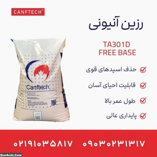 رزین Canftech® TA301D، یک رزین آنیونی ضعیف با ساختار ماکروپور پلی‌استایرن است که با گروه عاملی آمین نوع سوم (دی‌متیل‌آمین) کار می‌کند. این رزین به دلیل ساختار ماکروپور خود، قابلیت جذب مولکول‌های آلی محلول را دارد و در برابر شوک مکانیکی، اسمزی و اکسیداسیون مقاوم است. با قابلیت احیای آسان با استفاده از مواد بازی باقی‌مانده از احیای رزین‌های آنیونی قوی، TA301D می‌تواند عمر مفید رزین‌های قوی را افزایش داده و از آلودگی‌های آلی جلوگیری کند.